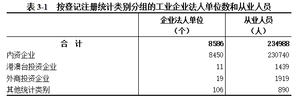 在工业企业法人单位从业人员中,内资企业230740人,占98.2%;港澳台投资企业1439人,占0.6%;外商投资企业1919人,占0.8%(详见表3-1)。