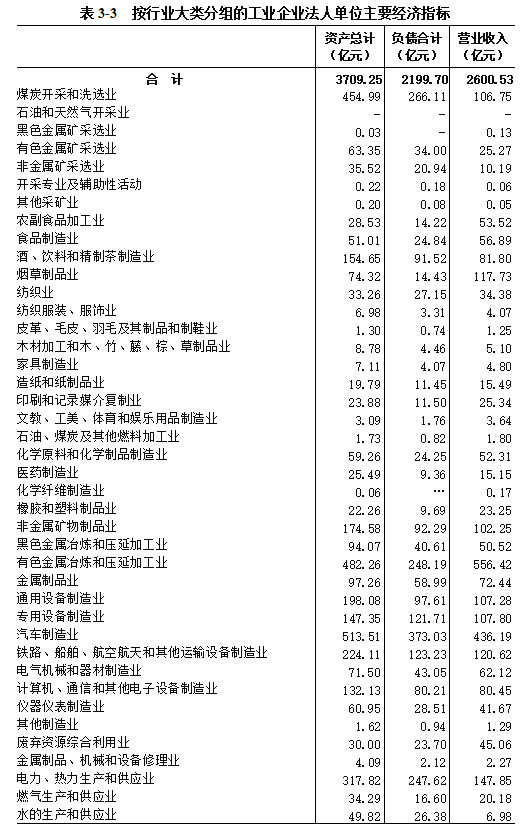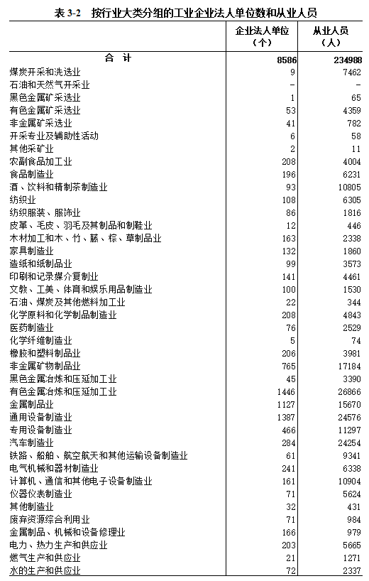 在工业企业法人单位从业人员中,采矿业12737人,制造业212978人,电力、热力、燃气及水生产和供应业9273人,分别占5.4%、90.6%和4.0%。在工业行业大类中,有色金属冶炼和压延加工业,通用设备制造业,汽车制造业从业人员数位居前三位,分别占11.4%、10.5%和10.3%(详见表3-2)。