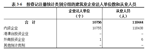 建筑业企业法人单位从业人员中,内资企业118438人,外商投资企业6人(详见表3-6)。