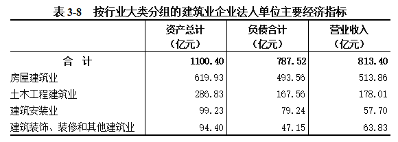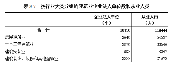 建筑业企业法人单位从业人员中,房屋建筑业占46.0%,土木工程建筑业占28.3%,建筑安装业占7.1%,建筑装饰、装修和其他建筑业占18.6%(详见表3-7)。