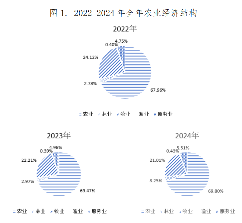 2024年全市农业经济总体运行平稳,但也存在经济作物面积下滑,畜牧业发展速度滞缓,林、渔业潜力尚未凸显等情况,需加以关注。