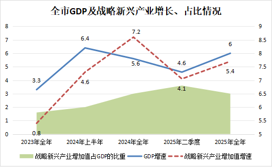 2025年全市战略性新兴产业增加值较上年增长5.4%,占GDP比重6.5%,拉动GDP增长0.4个百分点。