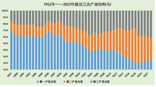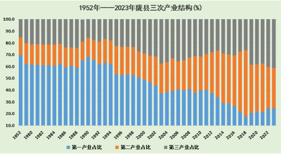 经济结构不断优化。陇县是一个传统农业大县,中华人民共和国成立初期,陇县农业占比较高,工业和服务业相对薄弱,产业结构单一,1952年一、二、三次产业增加值分别为214万元、46万元、47万元,三次产业比为69.7:15.0:15.3。经过75年的历程,三次产业发展融合推进,经济结构显著优化。2023年三次产业结构调整为24.7:34.0:41.3,与1952年相比第一产业占比降低45.0个百分点,第二产业、第三产业占比分别提高19.0、26.0个百分点,产业结构由过去的“一三二”优化为“三二一”模式。