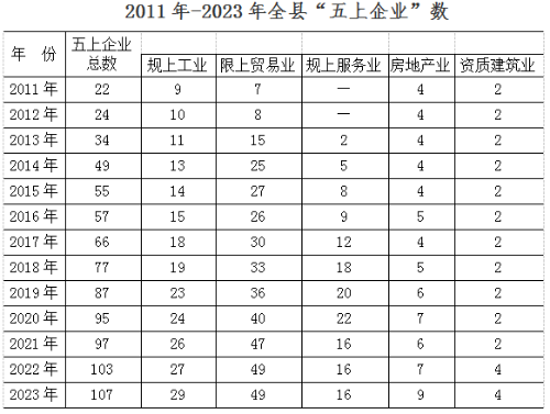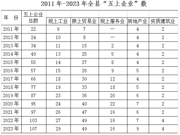 五上企业集群赋能增长。2010年国家统计局提出了四大工程建设,2011年开展企业一套表改革试点,2012年正式推进一套表改革工作,统计标准由最初的“三上企业”变为现在的“五上企业”。“下转上”“小升规”“产转法”等各类培育壮大措施的持续实施,全县规上企业数量增加,规模扩大。2011年全县“五上企业”22户,到2023年增加到107户,13年增加85户,年均增长14.1%。