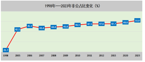 非公占比逐年提升。在一系列非公有制经济发展政策措施的促使助推下,陇县民营经济稳步发展,对经济总量的贡献持续加大。1998年非公有制经济实现增加值11305万元,到2023年达到516798万元,年均增长16.5%,占GDP的比重由1998年的21.7%提高到2023年的50.95%,提高29.25个百分点,成为支撑全县经济的“半壁江山”,是经济发展的重要增长极。